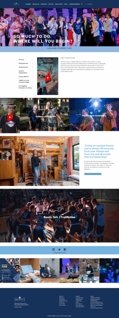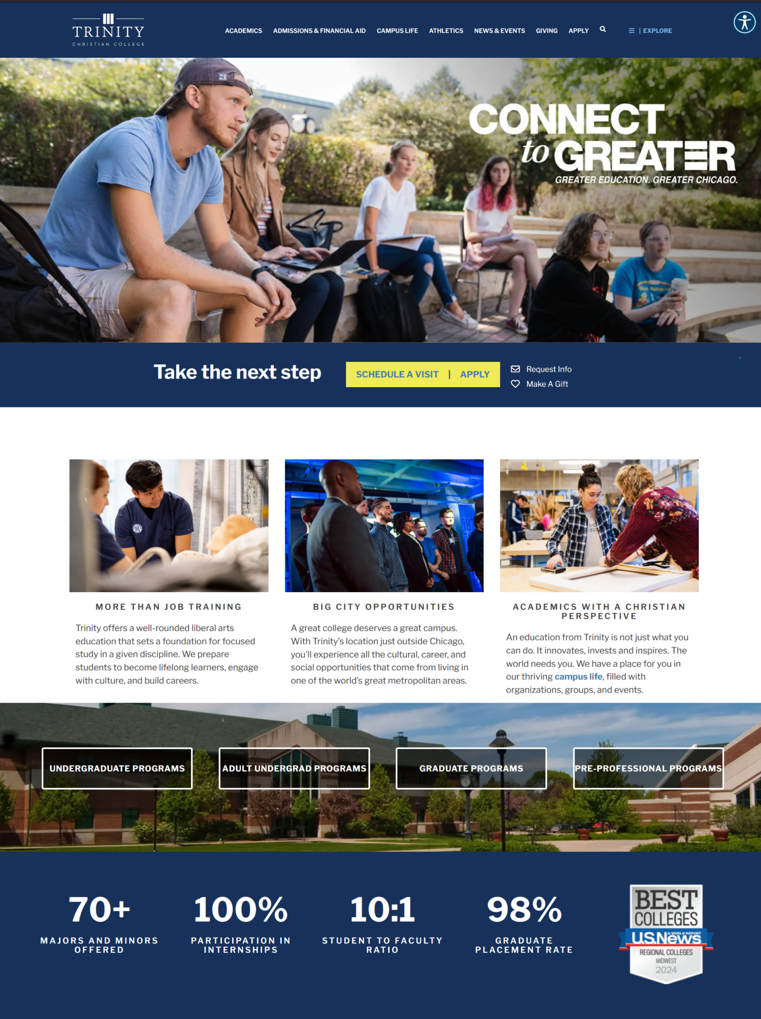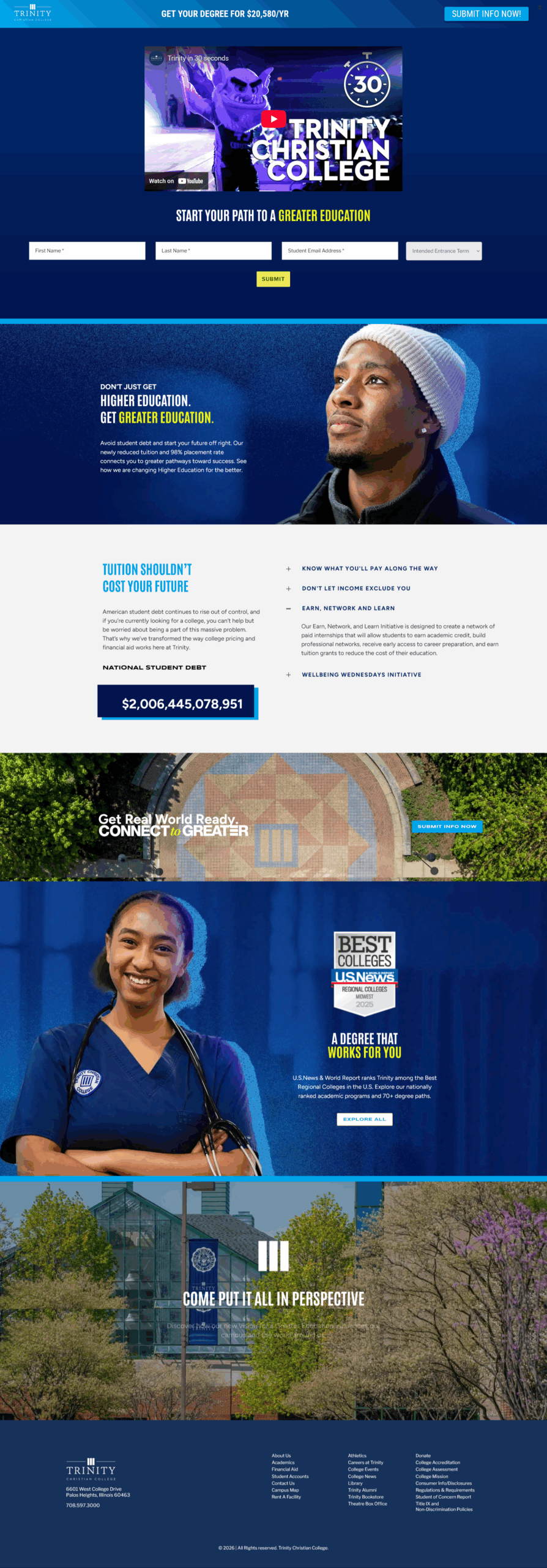 At Trinity Christian College, I served as the web developer. This role required a “full-spectrum” approach, ranging from deep-level PHP and JavaScript customization to the design of high-converting landing pages and integrated marketing campaigns.